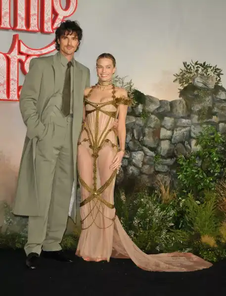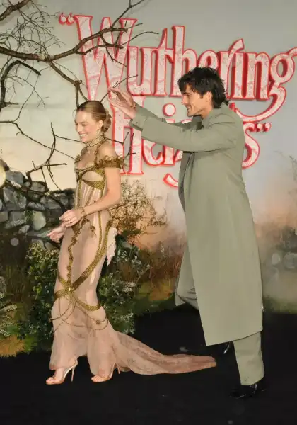 На червоній доріжці колегам до фільму довелося прикриватися від лондонського вітру та дощу, але 28-річний Елорді з усмішкою кинувся на допомогу 35-річній Роббі, коли вона позувала фотографам. Цей момент перегукується зі сценою із фільму, де герої стоять під зливою. Роббі народилася на прем'єру в напівпрозору блідо-рожеву сукню-корсет із золотим оздобленням і довгим шлейфом, створеним лондонським дизайнером Діларою Фіндікоглу. Особливу увагу привернув браслет на руці актриси, він належав Шарлотті Бронте і складається з волосся її сестер Емілі та Енн.