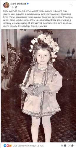 — Коли йдеться про гідність та захист українців – я вього лиш згадую свої відчуття у харківському дитячому садочку. Коли мені було п’ять, і я говорила українською. Коли ти з дитинства б’єшся за себе та свою ідентичність, потім це – як дихати. Хтось зрозумів це у лютому минулого року. Я все життя в революції гідності як дочка свого народу. Х – характер, Харків, харизма, – написала Бурмака.