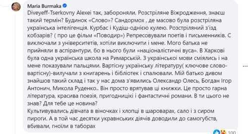 — Так, забороняли. Розстріляне Вижродження, знаєш такий термін? Будинок «Слово»? Сандармох, де масово було розстріляно українську інтелігенцію. Курбас та Куліш – однією кулею. Розстріляний з’їзд кобзарів? (Про це фільм «Поводир») Репресували поетів та письменників. Їх виключали з університетів, хотіли виключити й мене. Мого батька не прийняли до аспірантури, бо мав «націоналістичні вуса». У Харкові була одна українська школа на Рімарській. З української мови сміялися і на мене показували пальцями. Стоячу українську літературу (ключове слово — стоїть) — вилучали з книгарень та бібліотек та спалювали. Мій батько дивом знайшов такий склад, і так у нас вдома з’явилися Олександр Олесь, Богдан Ігор Антоніч, Микола Руденко. Він просто врятував ці книжки. Це просто гарна література, гарна поезія, пригодницькі та фантастичні романи. Ти цього не знав? Тобі це новина?