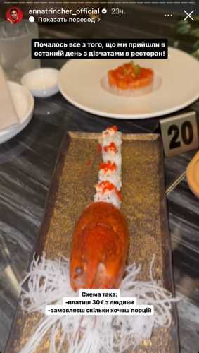 – Ми замовили страви, поїли дуже смачно. Залишилася одна порція ролів та ще трохи їжі. Вийшла офіціантка та каже, що ми будемо змушені заплатити за те, що залишилося. Я сказала, що, на жаль, нас не попереджали про це, тож ми не платитимемо, — зазначила виконавиця.