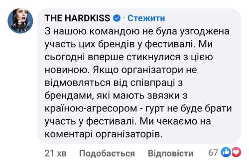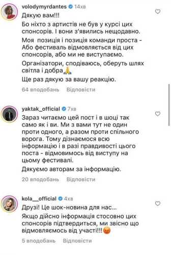 У коментарях під постом більшість заявлених у фестивалі артистів написали, що з ними не погоджували участь цих спонсорів.