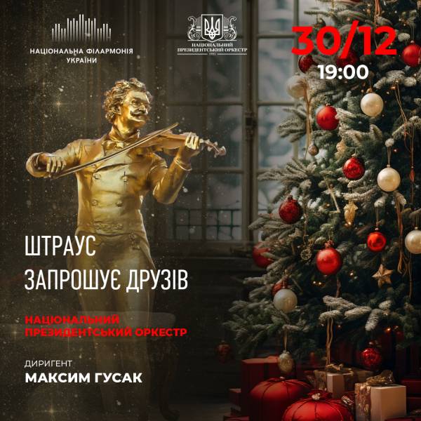 30 грудня «Штраус запрошує друзів». Національний президентський оркестр під орудою військового диригента, підполковника Максима Гусака  в унісон зі Штраусом запрошують на феєричну програму з легких, танцювальних, і жартівливих творів, які у європейських столицях зазвичай грають під час різдвяних балів. Увертюри до оперет, вальси, гавоти, марші, кадрилі, польки, – попри всі наші реалії налаштують на святковий новорічний настрій. І хоч поки ми не маємо змоги танцювати на балах галоп «Зітхання» Йоганна Штрауса чи «Галоп з шампанським» Ганса Лумбю або вальс «Королева балу» Лероя Андерсона – ми можемо під ці запальні ритми помріяти, як ми це зробимо після Перемоги! Тим більше, у фіналі, звучатиме наш всесвітній «Щедрик» Миколи Леонтовича.