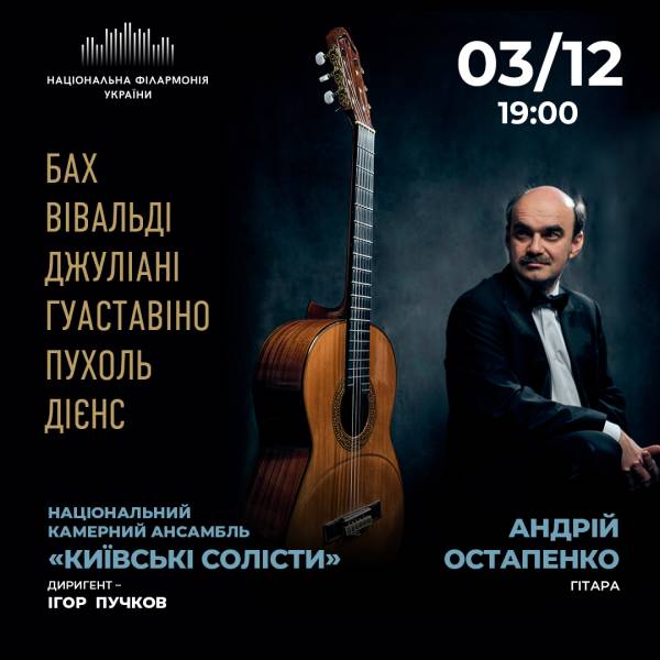 3 грудня Вечір гітарної музики від бароко до сучасності подарує Національний камерний ансамбль «Київські солісти» під орудою диригента Ігоря Пучкова за участю Андрія Остапенка.