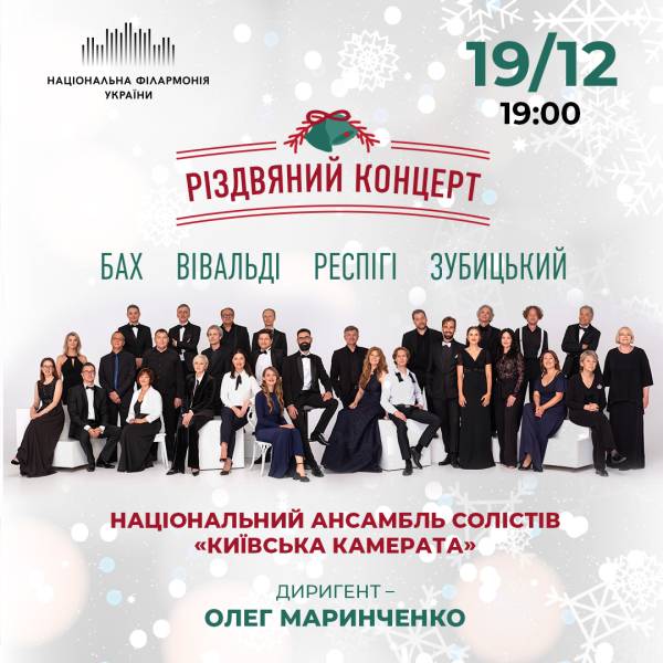 Наступного дня, 19 грудня, – ще одна передріздвяна музична подорож разом із Національним ансамблем солістів «Київська камерата» проляже одразу через кілька музичних епох: від творів Антоніо Вівальді, Отторіно Респіґі та Йоганна Себастіана Баха до «Россініанаи» сучасного українського композитора Володимира Зубицького, в якій уважний слухач впізнає найвідоміші теми з увертюр та опер Россіні – «Севільський цирульник», «Вільгельм Телль», із пісні «Тарантела».