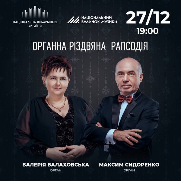 27 грудня Національний будинок музики теж запропонує концерт «Різдвяна рапсодія» за участю знаних органістів Валерії Балаховської та Максима Сидоренка. У програмі звучатимуть твори Преторіуса, Букстехуде, Баха, Генделя, Вейда, Хорна, Маккіа, Жигу, Дебуа, Грубера, Скотта.