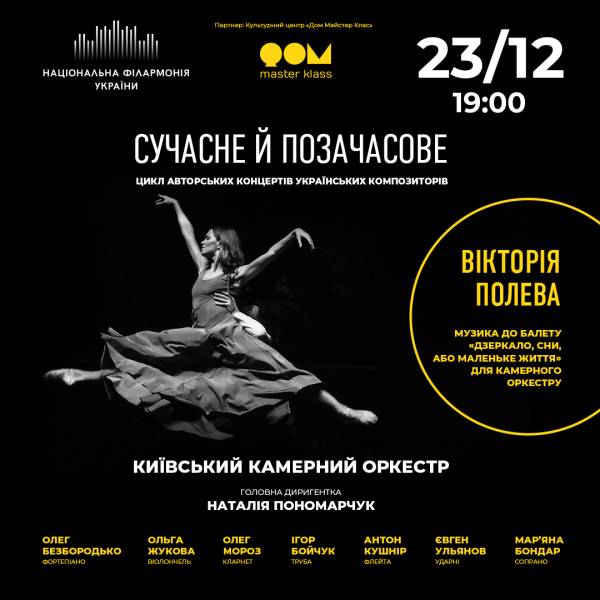 23 грудня «Сучасне й позачасове» – новий проект, започаткований Домом Майстер клас і Національною філармонією України, який представляє серію авторських концертів сучасних українських композиторів, які вже увійшли в історію української музичної культури.