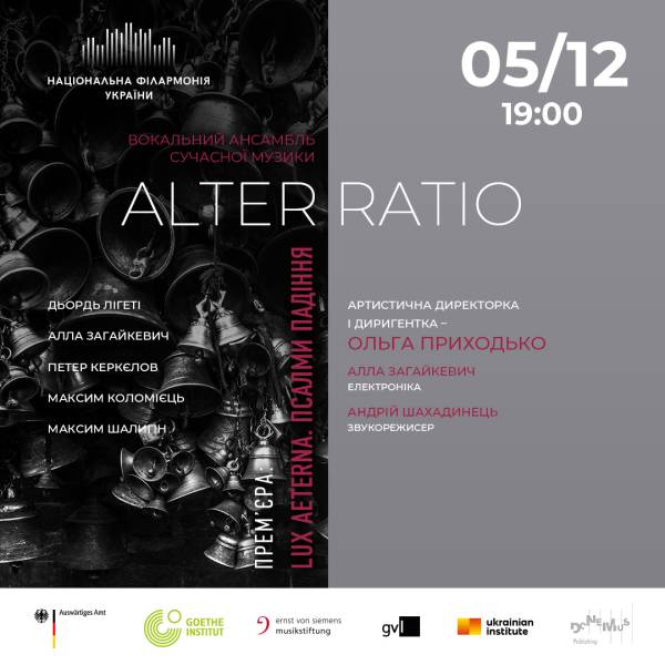 5 грудня «Lux aeterna. Псалми падіння» – новий проєкт ансамблю Alter Ratio, основною темою якого є пам’ять. Це пам’ять і тяглість української та європейської культур; вшанування пам’яті класика музичного авангарду Дьордя Лігеті (до 100-річчя від дня народження); збереження пам’яті за полеглими українськими митцями, які стали на захист України від російської агресії.
