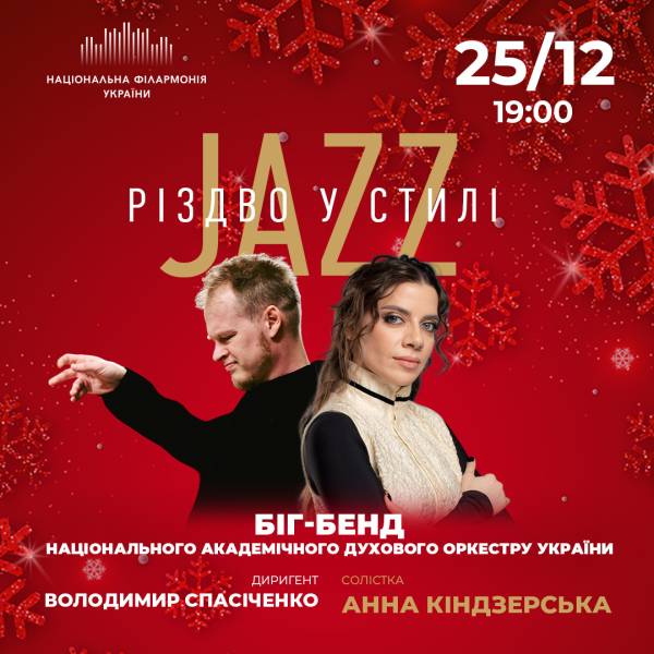 25 грудня Колонний зал запрошує на Різдво у стилі jazz з Національним духовим оркестром України під орудою Володимира Спасіченка та солісткою Анною Кіндзерською, у виконанні яких прозвучить більше 20ти найулюбленіших та найпопулярніших різдвяних хіта. Серед яких, звісно, й Jingle Bells і Santa Claus is Coming to Town, The Christmas Song, Winter Wonderland, The Christmas Waltz, Jingle-Bell Rock, Big Band Christmas, Santa, Baby, I`ll Be Home For Christmas і нарешті All I Want for Christmas is You з репертуару Мерая Кері.