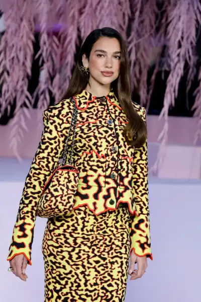 Дуа на показ прийшла, відзначившись фірмовим барвистим диско-стилем, у яскраво-жовтому комплекті з червоною окантовкою та абстрактним коричневим плямистим принтом. Інші друзі Chanel віддали перевагу більш стриманій палітрі, у тому числі класичній чорно-білій.