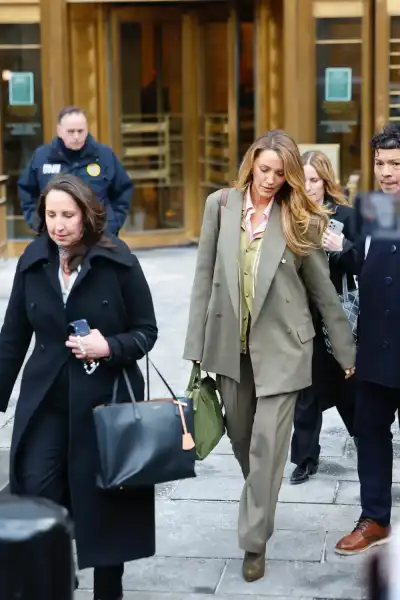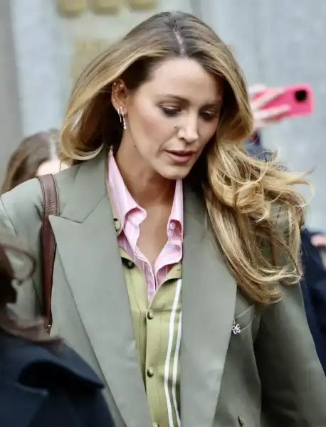 Блейк, яка залишала слухання у похмурому настрої, була одягнена в оливковий брючний костюм-двійку з двобортним піджаком, ніжно-рожеву сорочку та салатовий смугастий кардиган-поло, які доповнила коричневими ботильйонами та зеленою сумкою-тоутом. Джастін перебував у більш піднесеному настрої і носив одяг тих самих тонів: режисер приміряв оливкове пальто, тонкий молочний джемпер і ніжно-рожевий кашеміровий шарф у поєднанні з коричневими штанами.